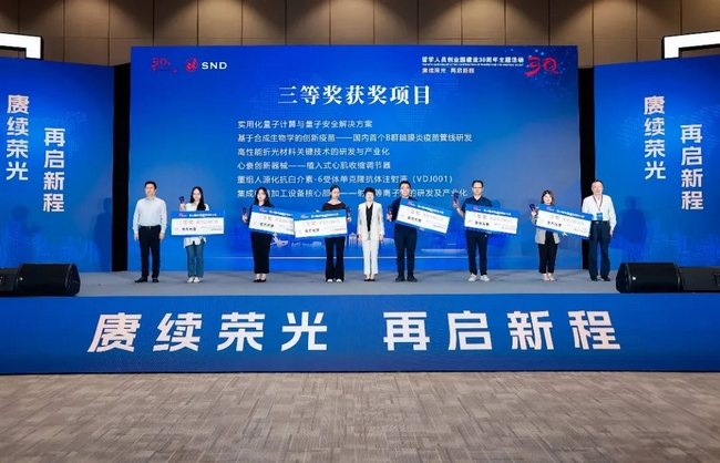 全國政協(xié)常委、港澳臺僑委員會副主任、 致公黨中央副主席兼秘書長盧國懿(圖右),蘇州市委常委、市委統(tǒng)戰(zhàn)部部長、市委秘書長王飏(圖左)為獲得一等獎的西安新通藥物研究團隊頒獎