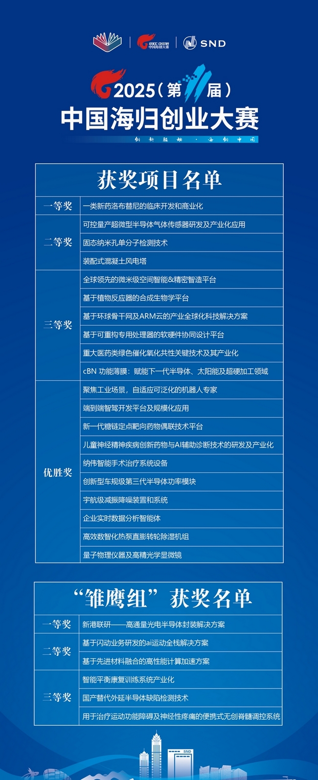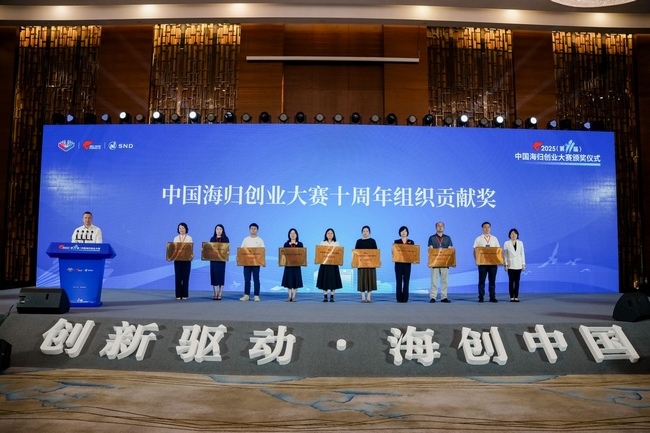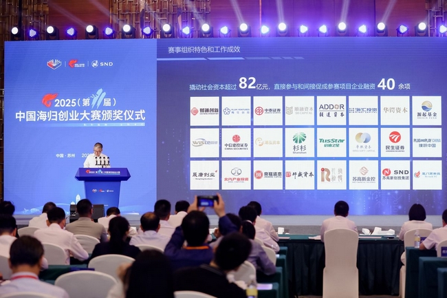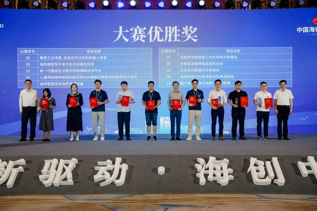 在頒獎儀式中,科技部、工信部、致公黨中央等大賽指導單位以及江蘇省、蘇州市有關部門領導為獲獎項目頒發了獎杯、獎金和證書?,F場還作了中國海歸創業大賽10周年總結,全面回顧了大賽舉辦10屆以來所重點開展的工作和取得的成果;發布了中國海歸創業大賽10周年TOP100優秀企業榜單,根據歷屆參賽企業近年來在企業成長性、科技創新力、行業影響力、地區貢獻度等方面進行綜合評定,有海柔創新、青禾晶元、杉數科技、斯乾智駕、漢陽科技、識光芯科、景略半導體、圣德醫療、英磁新能源等100家優秀企業入選。此外,活動還為在大賽組織服務中作出重要貢獻、給予推動支持的一批單位頒發了中國海歸創業大賽10周年特別貢獻獎和組織貢獻獎,并舉行了中國海歸創業大賽成果轉化基地啟動儀式及項目簽約儀式。